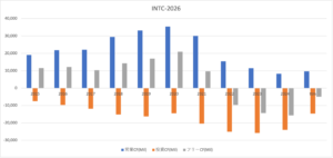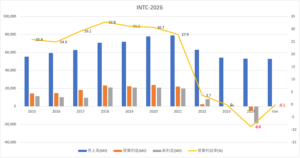 インテルはパソコンとデータセンター向けに半導体を製造する米国企業です。23年以降からAIブームがあるも、25年3Qの売上成長率は前年比+2%、4Qは−4%と不調から脱出できていません。